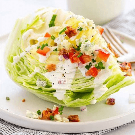 Bacon bites, blue cheese dressing , Pickle Red onion, tomato