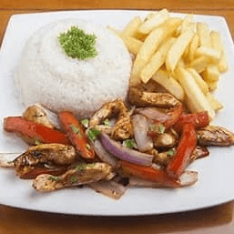 Whole chicken , Large chaufa, salchipapa, 2 lt soda + 3 green sauce