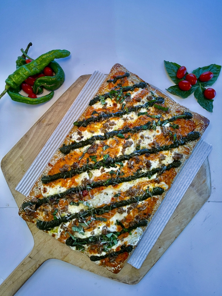 Homemade vodka sauce, blend of fresh mozzarella, spicy sausage & fresh basil drizzled w/ basil pesto on a sesame seed crust