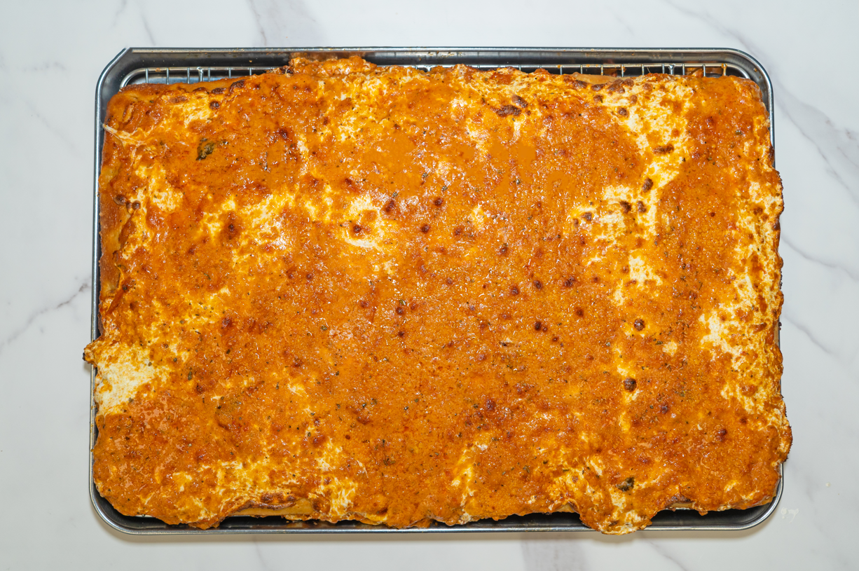 Our signature upside-down Sicilian w/ mozzarella on the bottom, vodka sauce on top layered w/ parmigiano grated cheese, EVOO & fresh basil