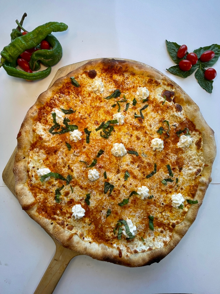Upside-down w/ fresh mozzarella on bottom vodka sauce on top, calabrian chili oil, whipped ricotta, EVOO, parmigiano cheese & fresh basil