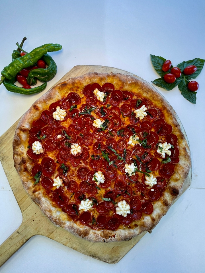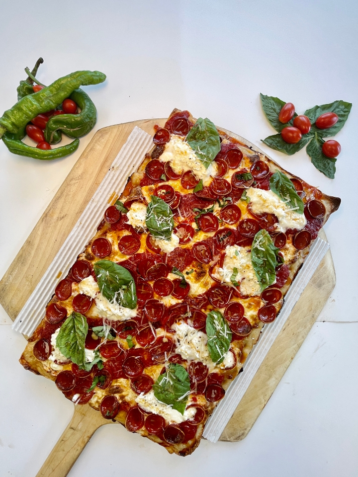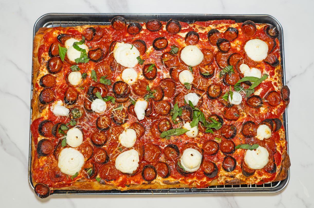 Sicilian Pie with Italian tomato sauce base, Cups and Char Pepperoni Cups, Burrata, Basil, and Mikes Hot Honey.