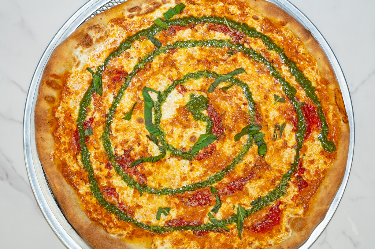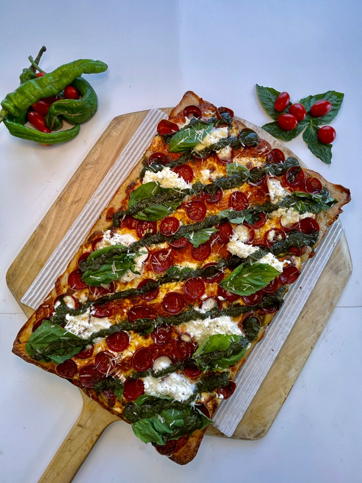 Sicilian Pie W/ Vodka Sauce base mozzarella, Cups and Char Pepperoni Cups, Burrata Cheese, Pesto, and Basil.
