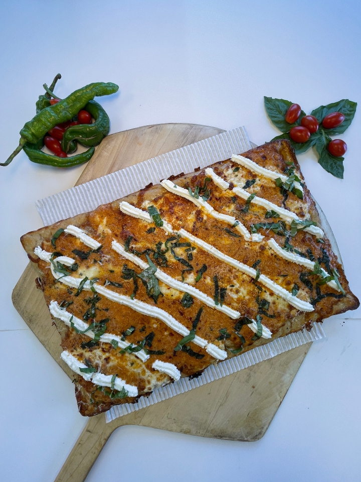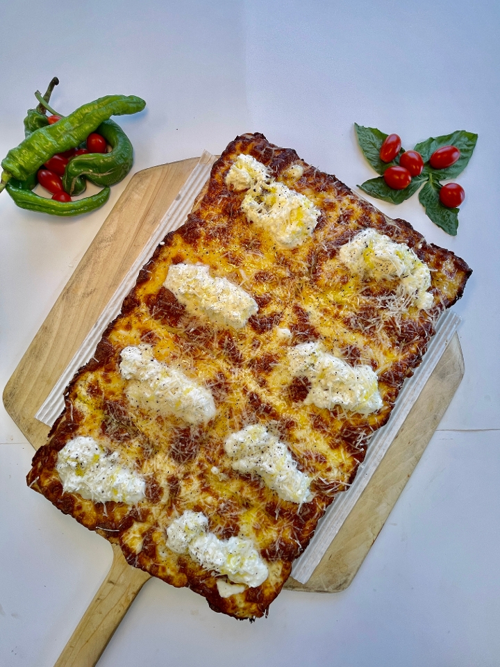 Square white pie w/ mozzarella, homemade stracciatella cheese, EVOO, coarse black pepper & Pecorino Romano cheese