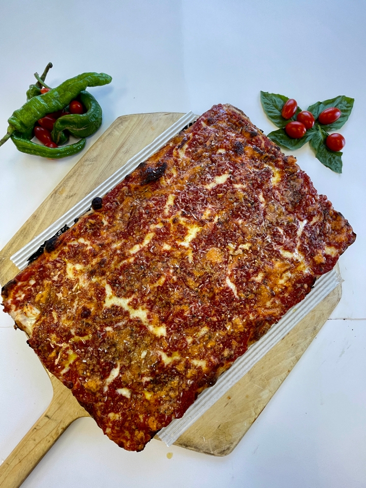 Our signature upside-down Sicilian w/ mozzarella on the bottom, sauce on top layered w/ parmigiano grated cheese, EVOO & fresh basil