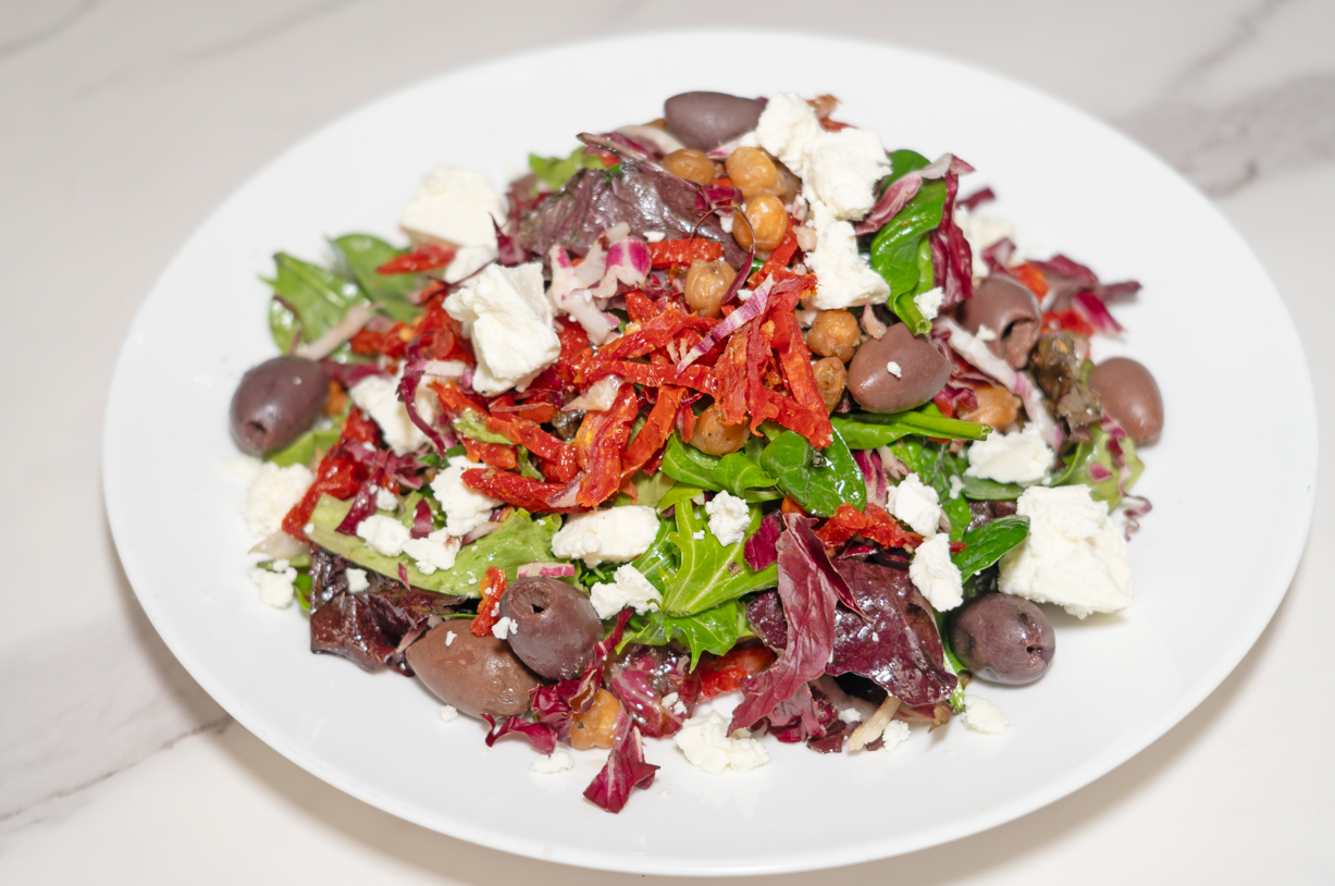 Roasted chickpeas, olives, feta, sun-dried tomatoes, mixed greens & radicchio w/ a lemon garlic dressing